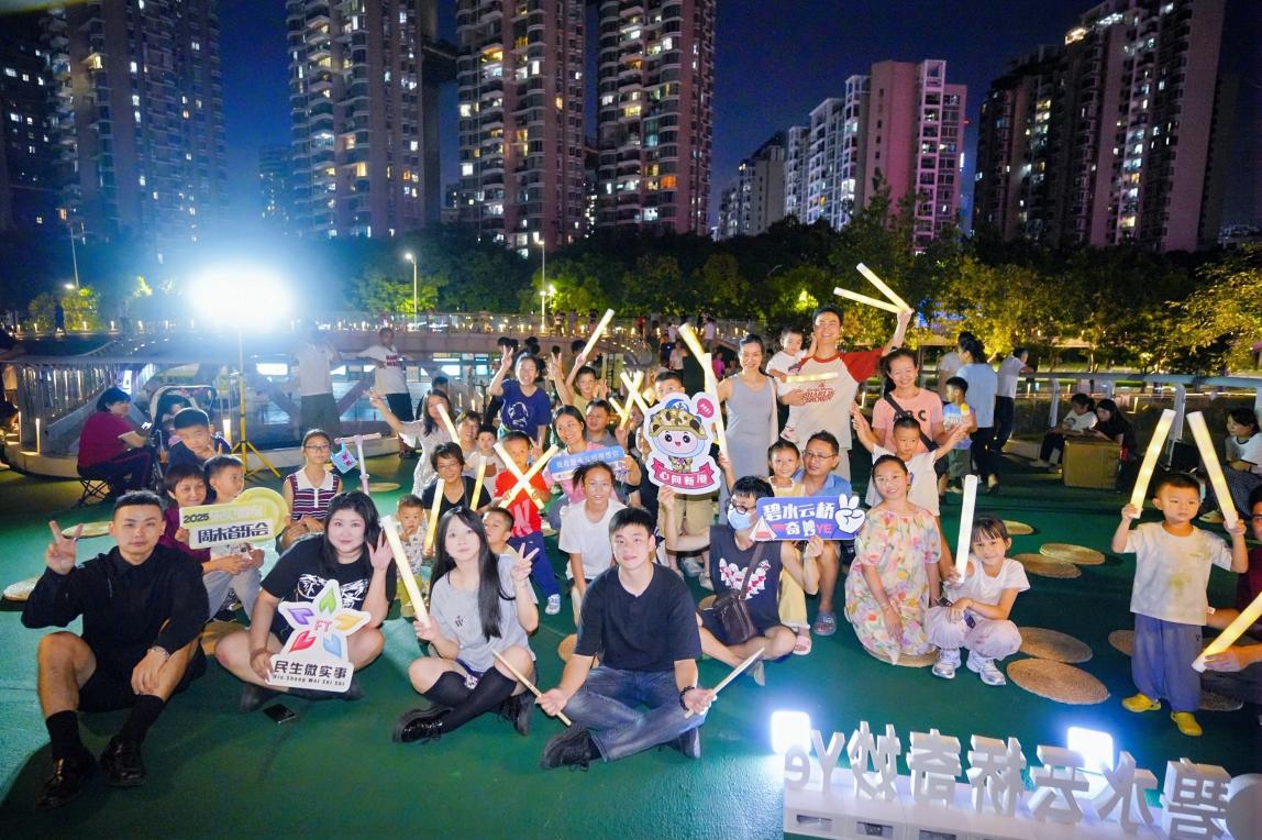 现场,柔和的灯光照亮碧水云桥,露营座垫错落摆放,市民或坐或站,伴着河畔微风静待演出。星愿乐队登场后,经典老歌与流行金曲轮番唱响,熟悉的旋律瞬间点燃全场热情,不少观众跟着节奏轻声哼唱,形成温馨的“全场大合唱”。当乐队与台下小朋友携手演绎《勇气大爆发》时,稚嫩的歌声与欢快的旋律碰撞,现场气氛直接推向高潮,掌声与欢呼声在河畔久久回荡。