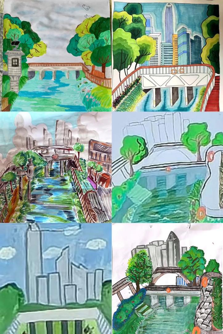 活动伊始,社区讲解员带着孩子们漫步河畔,从新洲河的历史变迁讲到如今的生态修复成果,从岸边的绿植特性聊到水中的鱼虾踪迹,生动的讲解为孩子们打开了“自然课堂”,也为写生积累了满满灵感。随后,碧水云桥下成为创作主场——远处是鳞次栉比的CBD高楼勾勒城市天际线,近处是新洲河两岸的绿植随风摇曳,孩子们铺展画纸、拿起画笔,将眼前的“生态画卷”与心中的“家乡热爱”一笔一划融入作品。现场,美术老师穿梭在孩子们中间,手把手指导构图技巧与色彩搭配,帮助他们更好地呈现眼中的河畔美景。
