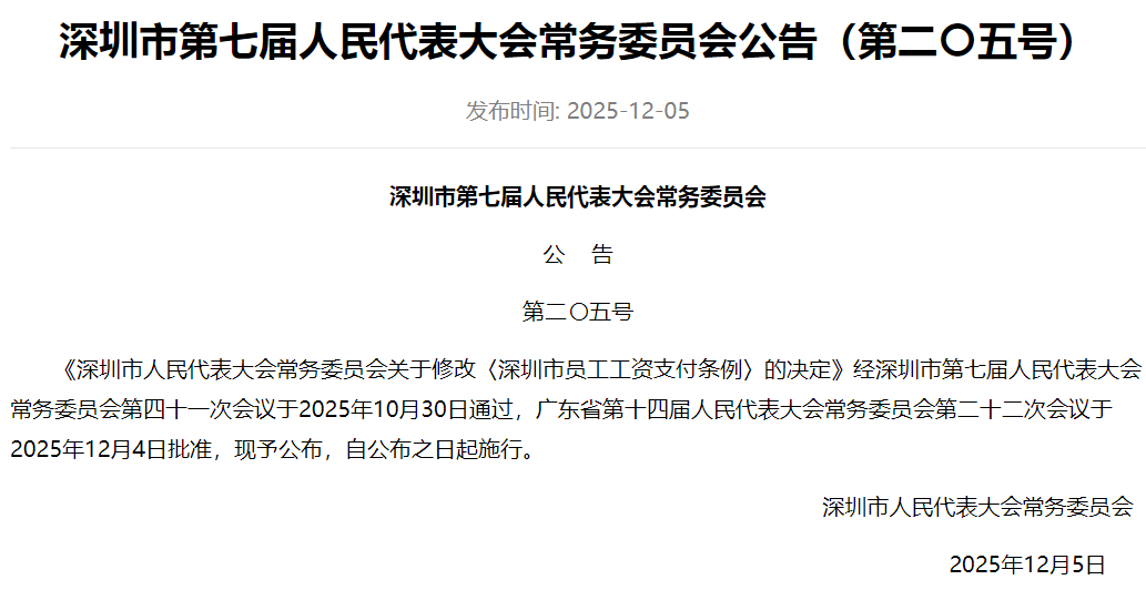 近日,深圳市人民代表大会常务委员会公布了关于修改《深圳市员工工资支付条例》的决定。