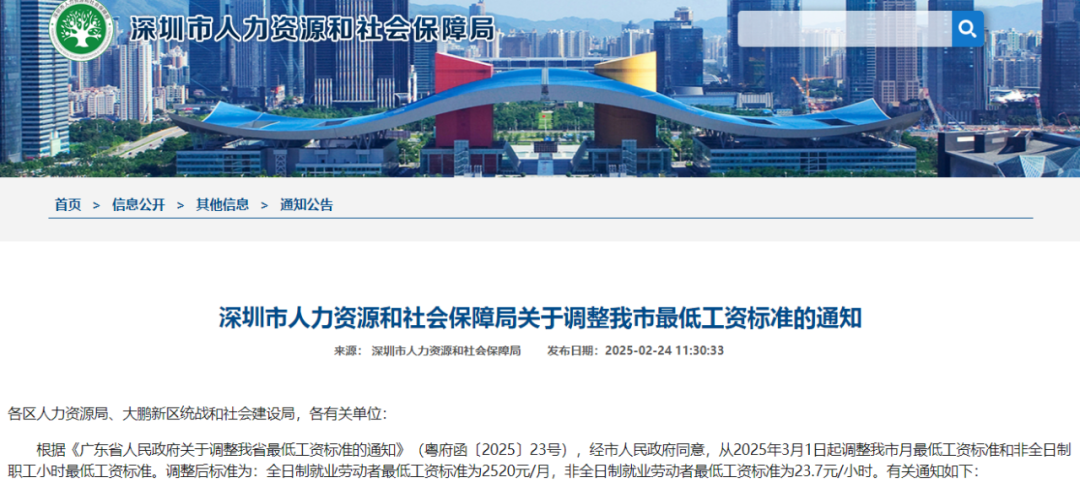 据深圳市人力资源和社会保障局通知,当前深圳最低工资标准上调至2520元/月,非全日制就业劳动者最低工资标准为23.7元/小时。