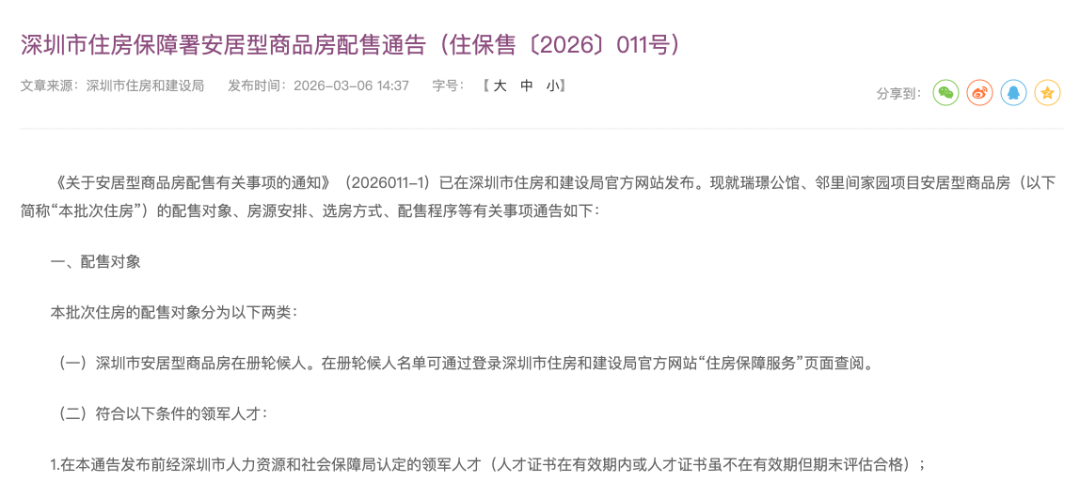 网上申请认购时间为2026年3月7日9:00至2026年3月15日18:00,本批次住房的配售对象、房源安排、选房方式、配售程序及其他提示请查阅已发布的《深圳市住房保障署安居型商品房配售通告》(住保售〔2026〕011号)