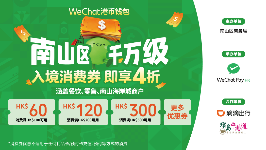 3月24日,南山区商务局携手微信香港钱包(WeChat Pay HK)宣布正式启动“2026年南山区入境消费券推广活动”。4月1日起至6月30日,千万级规模的入境消费券将落地首轮派发,覆盖南山热门餐饮、零售企业门店及南山海岸城购物中心商圈,可享低至四折优惠。用实实在在的优惠,邀你来南山逛吃游玩,解锁更多消费惊喜。
