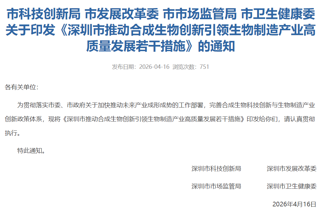 4月16日,《深圳市推动合成生物创新引领生物制造产业高质量发展若干措施》印发实施。《措施》从13个方面推出系统性举措,明确对涉及重大技术系统或重大装备的攻关项目单个最高支持1亿元。